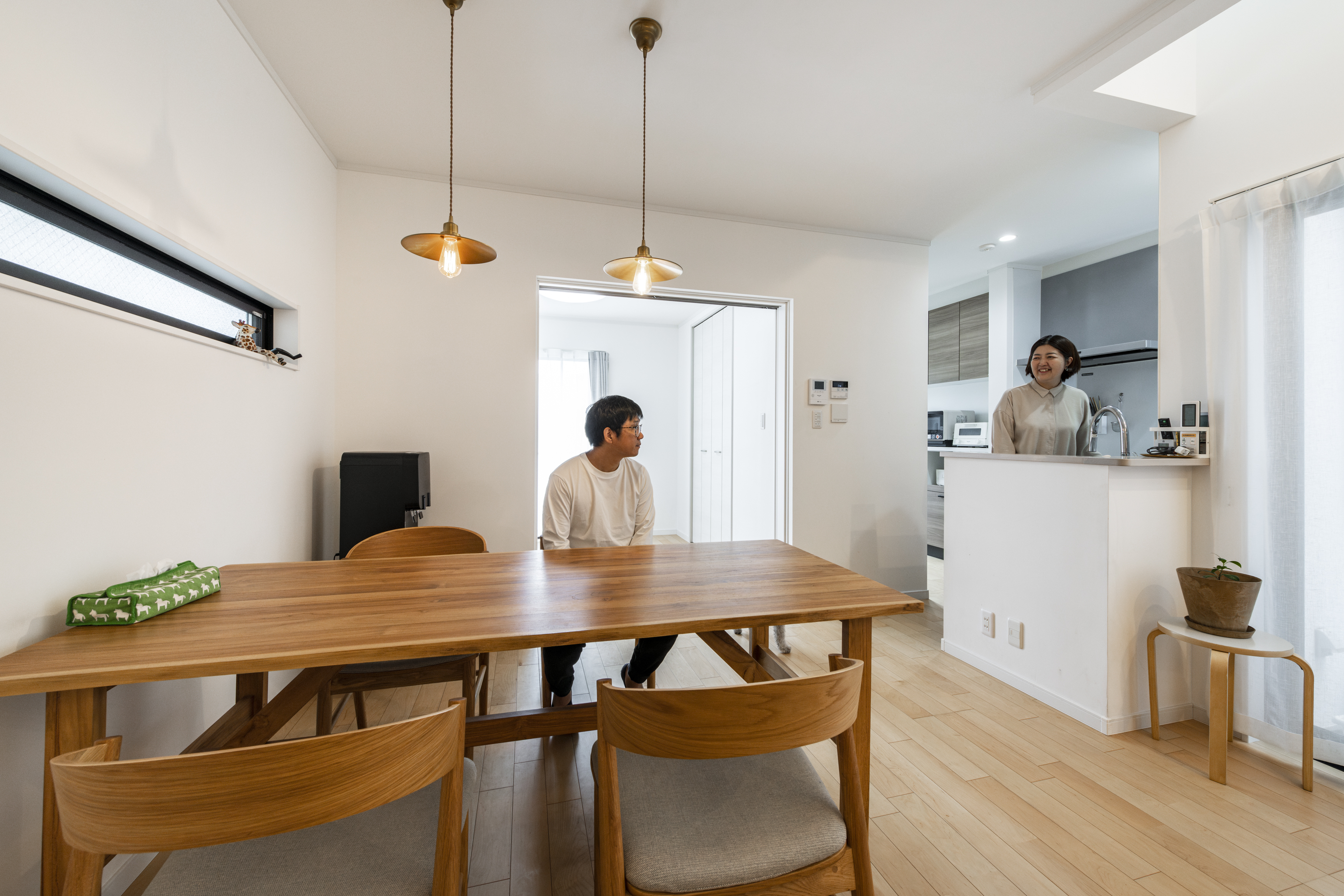 Y様ご夫婦は、間取りについて色々と希望はあったものの、窓の位置や形状については全く頭になかったとのこと。設計士の方からの提案で、リビング・ダイニングの高天井をはじめ横長のスリット窓やキッチンの勝手口、トイレ前の縦型のスリット窓などを設置できたそうです。「おかげで室内の採光や風通しが良くなって、快適に過ごせています。こういったことは経験が豊富なプロじゃないと気が付かないですよね」と喜ばれていました。