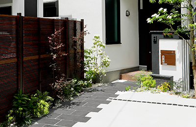 御影石を敷石のように埋め込んだアプローチに沿ってハーブなどの植栽が玄関まで続きます。2階からも緑を楽しめるシンボルツリーも採用。