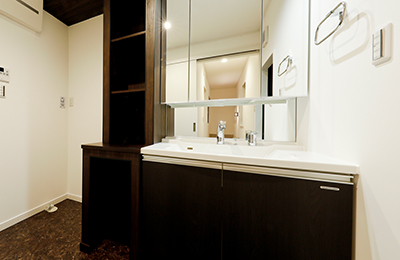 タカラスタンダードのエリシオを採用。シャワー水洗、大容量収納の三面鏡は高演色のLEDでより自然な顔色うつり等々高機能の洗面台です。