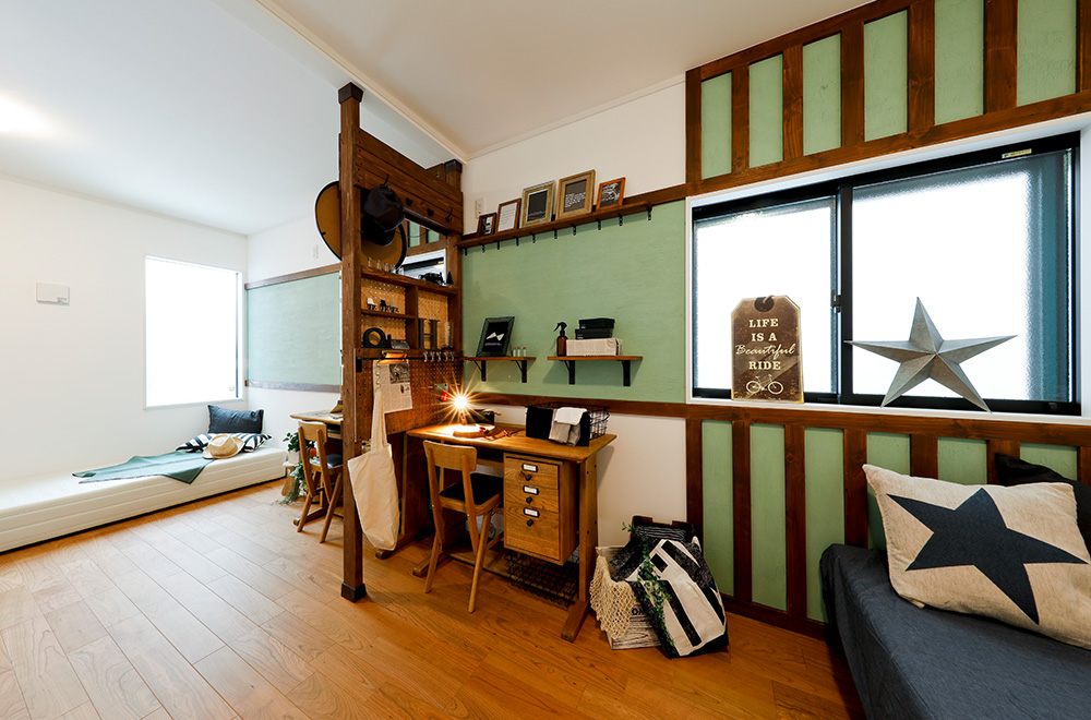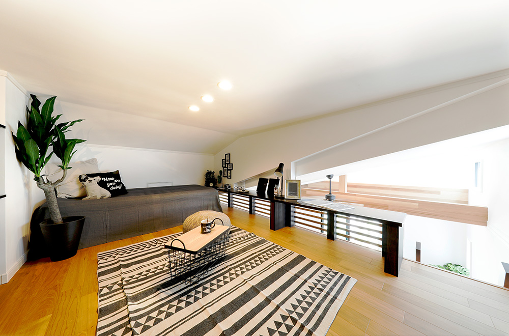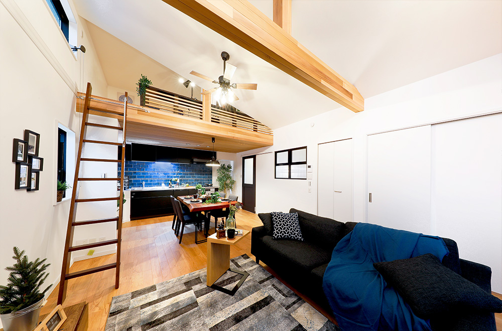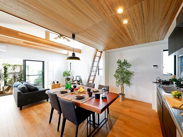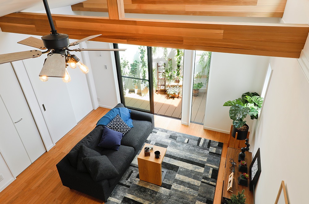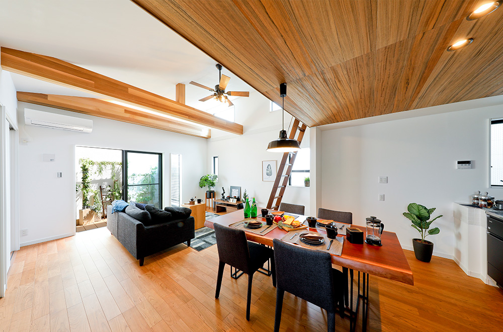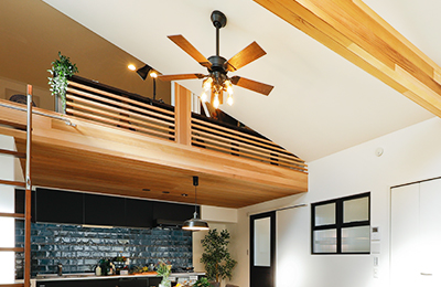 木製のシーリングファン付きの照明は、室内に合わせて意匠しておりLDKを彩ります。