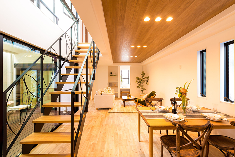 中庭とリビングダイニングの間に設けたオープン階段。曲線のデザインを施したアイアンの手すりが華やかな雰囲気です。視界に入りやすい階段の存在感を逆手に取り、デザイン性を高めて景観に違和感なく溶け込ませることに成功しました!