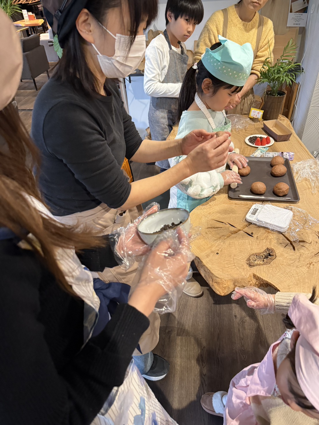 森のテラスカフェのパン職人と一緒に、チョコパンの生地を成型してチョコチップをつめて、発酵させて焼き上げるという本格的なパン作り体験でしたよ🎵