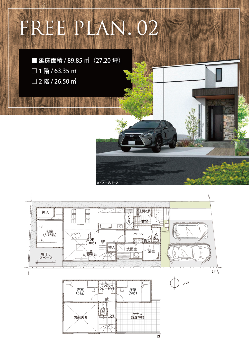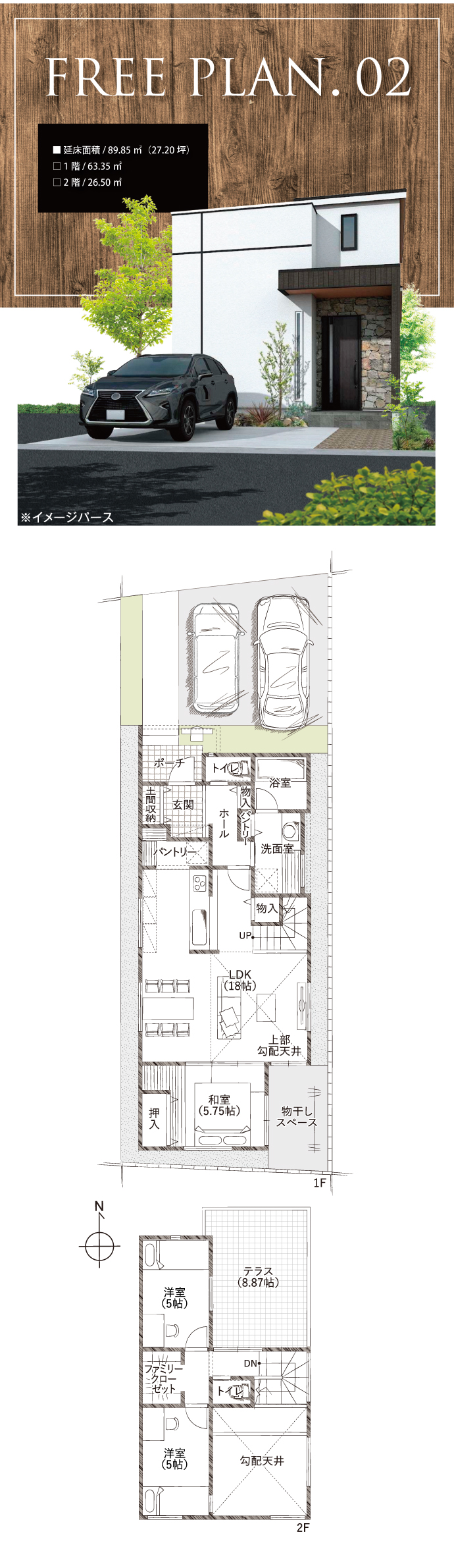 3LDK+タタミコーナー+2台駐車ガレージ ■敷地面積/126.99㎡■延床面積/93.98㎡ ●1階/56.72㎡ ●2階/37.26㎡