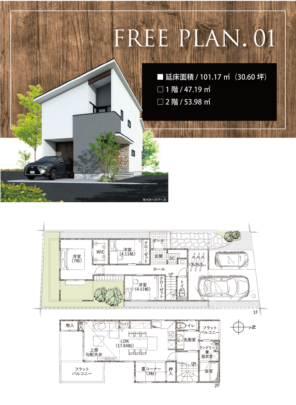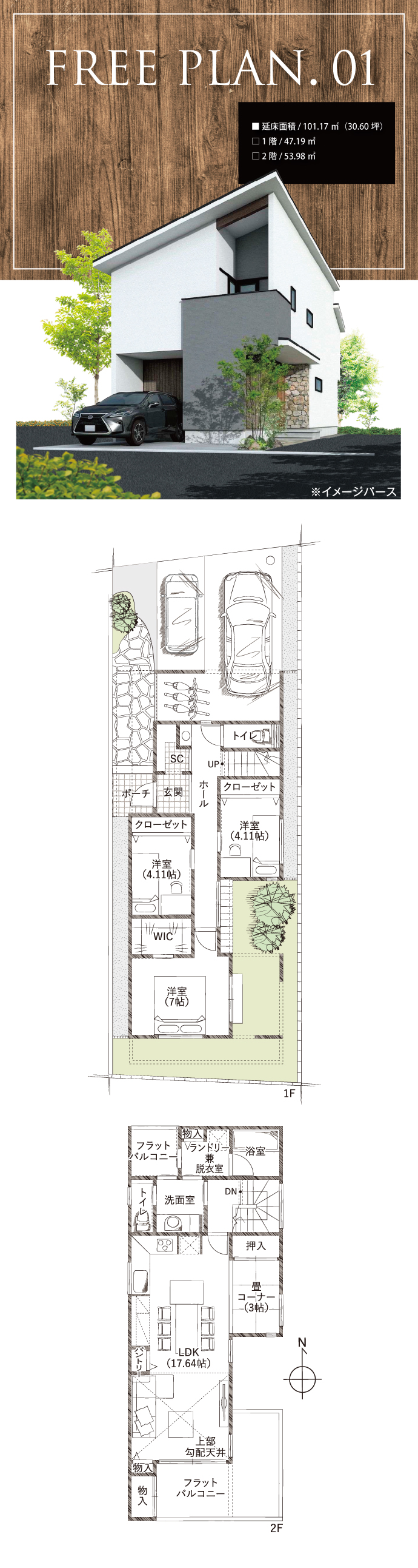 3LDK+タタミコーナー+2台駐車ガレージ ■敷地面積/117.06㎡■延床面積/93.98㎡ ●1階/56.72㎡ ●2階/37.26㎡