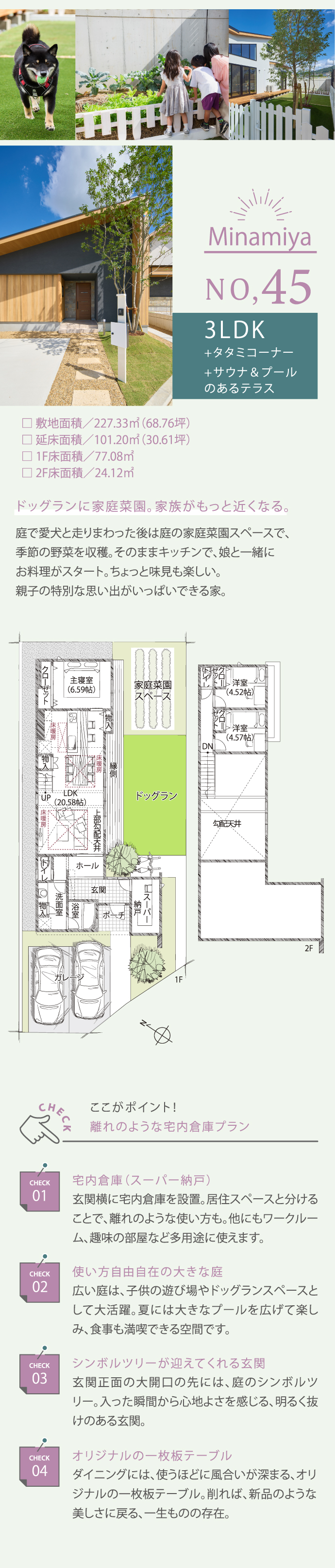 3LDK+パントリー ■敷地面積/261.10㎡(78.98坪) ■延床面積/100.81㎡(30.49坪) ●1階/76.70㎡ ●2階/24.11㎡