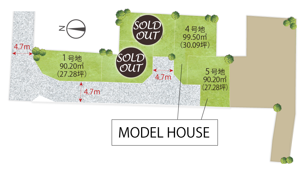 - 北側(公道)約4.7m、分譲地内道路約4.7m