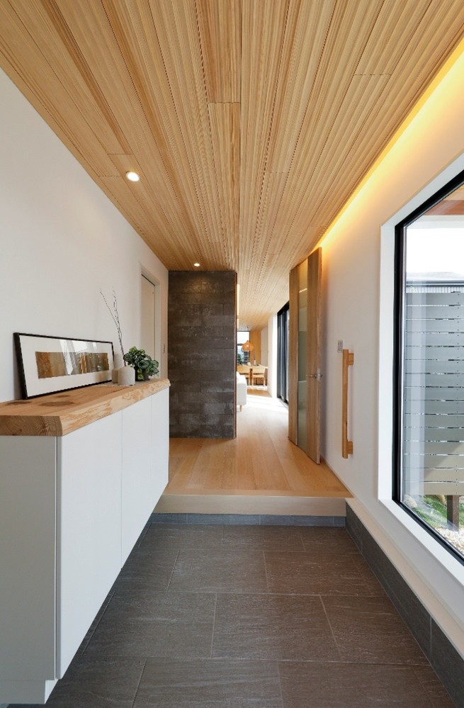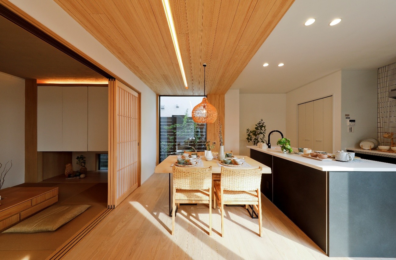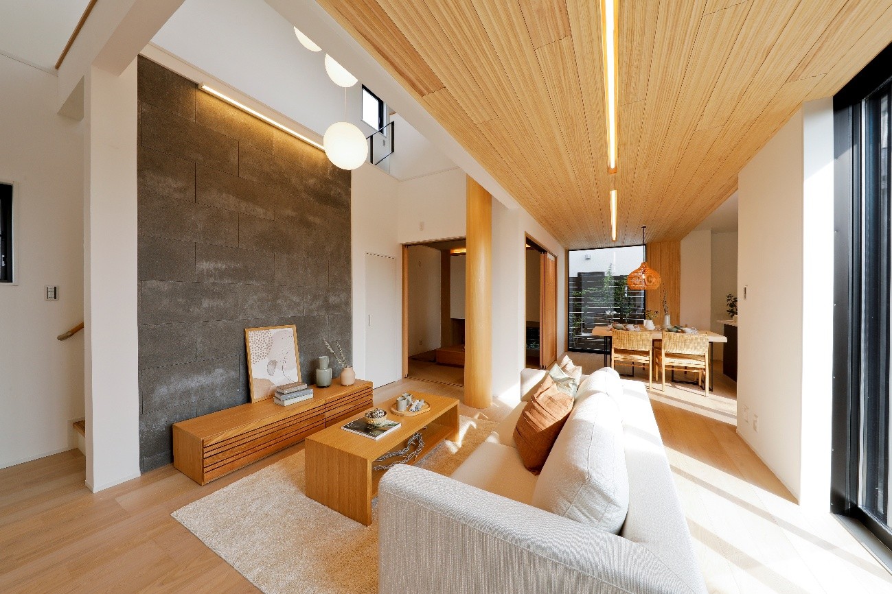 リビングにそびえる野村工務店こだわりの大黒柱に合わせ、和モダン空間とした。玄関からリビングまで伸びる幅2m、奥行10mの無垢板天井が住む人を迎え入れるイメージで設えています。