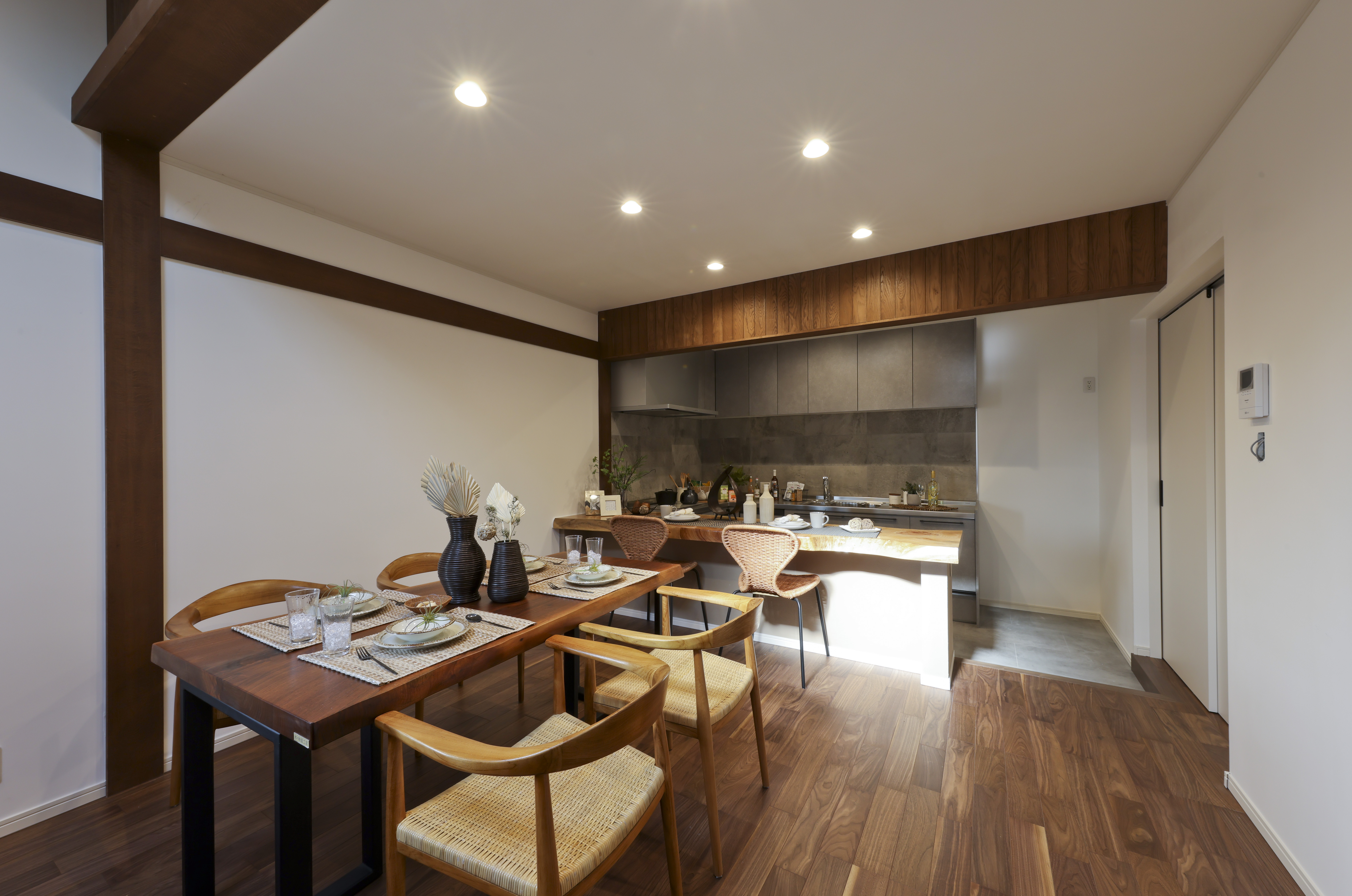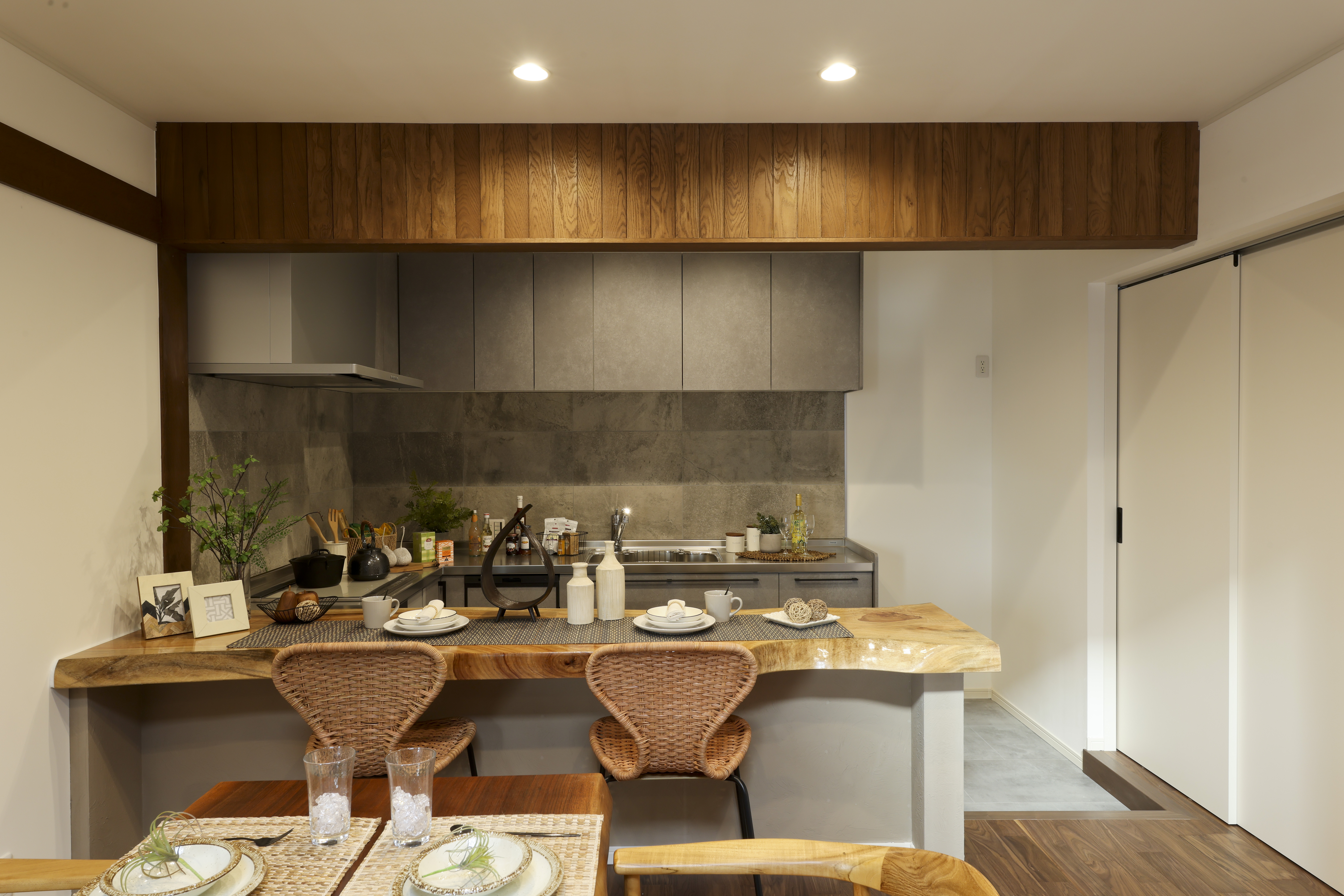 ・キッチン棚も設けコの字型にすることで、収納スペースの確保だけでなく軽食等にもお使いいただけます。