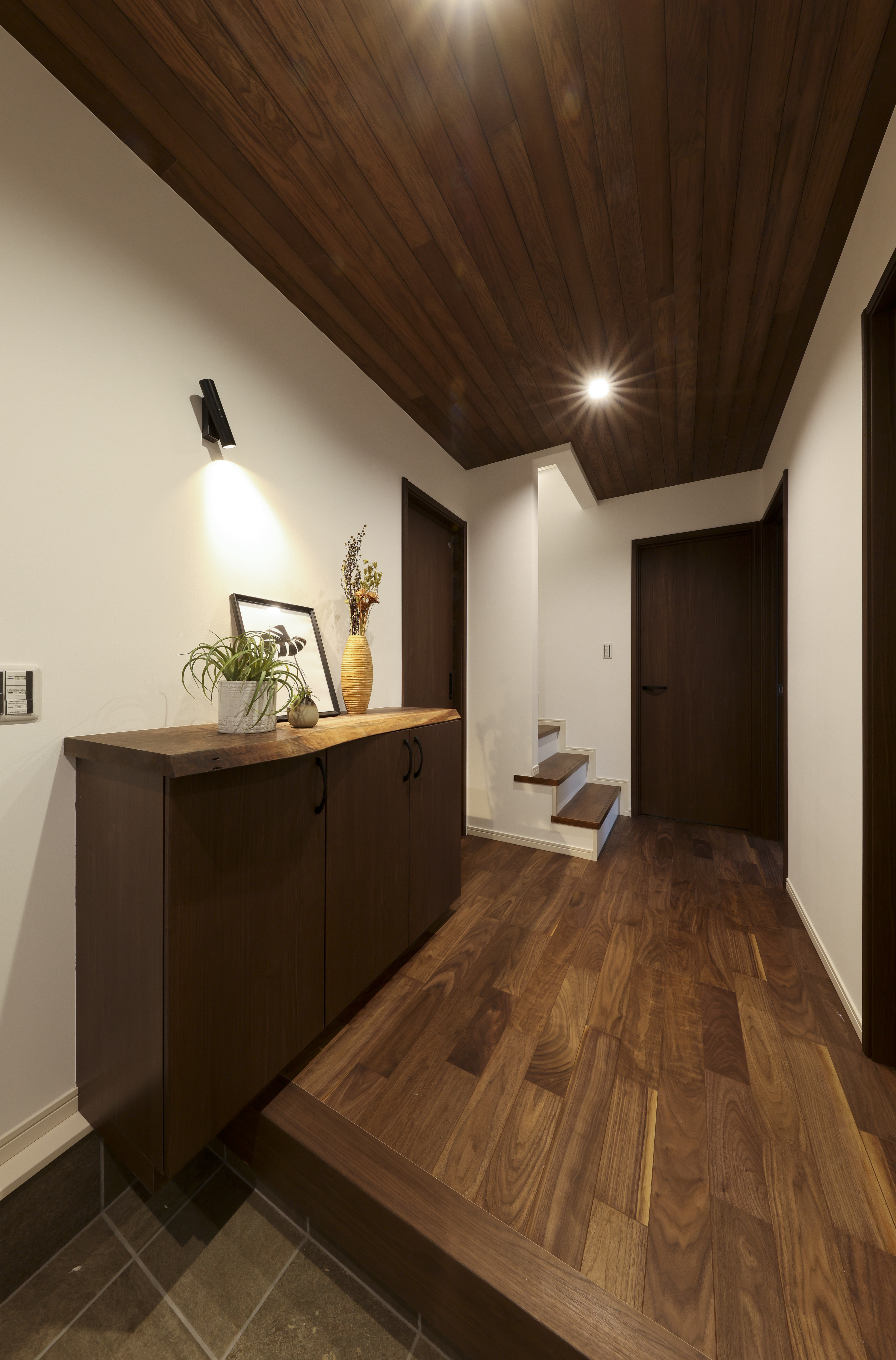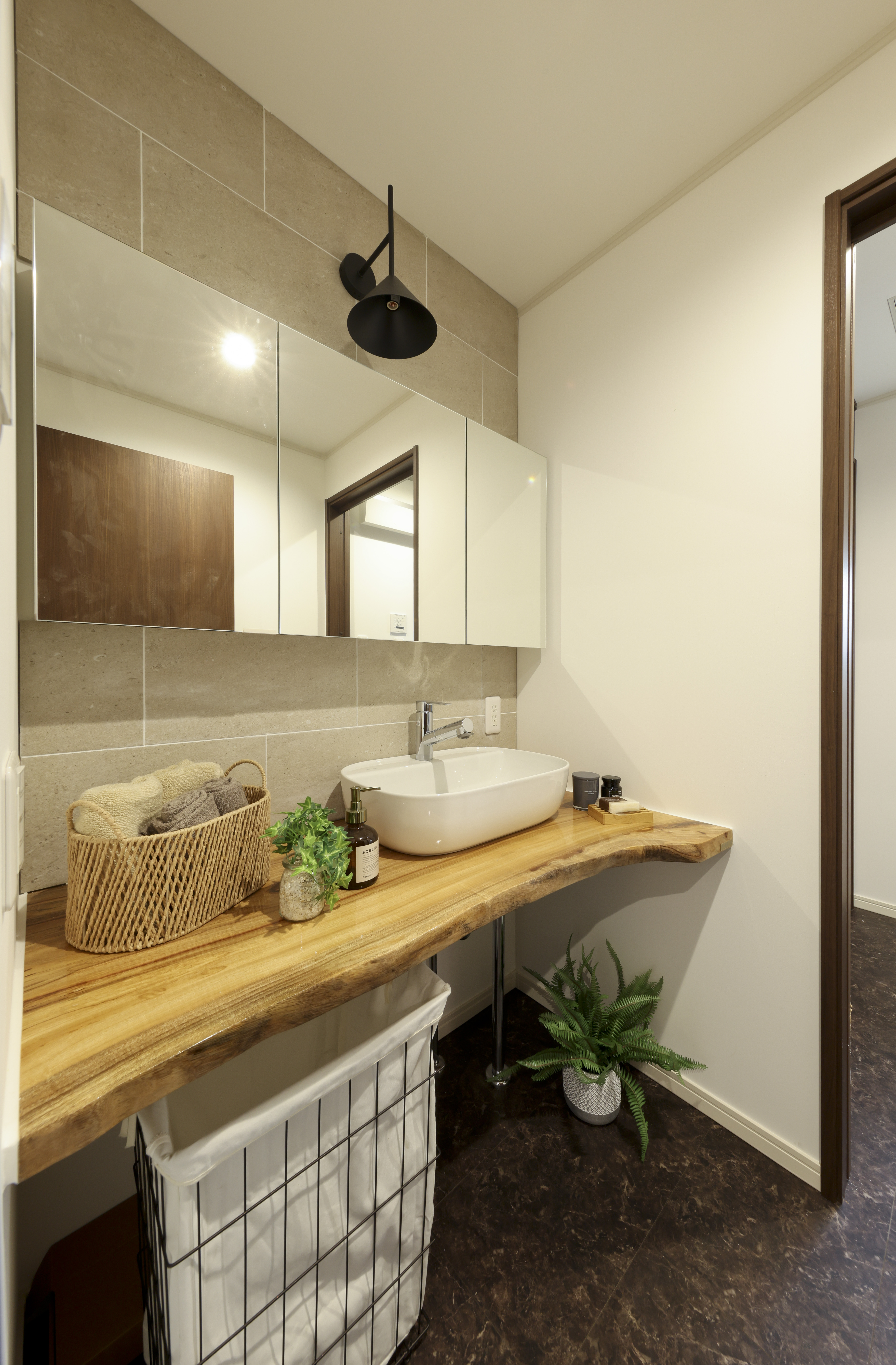 ・野村工務店の家具事業である「木の物語工房」の商品である一枚板を使用し、高級感かつ重厚感を感じるようにしました。