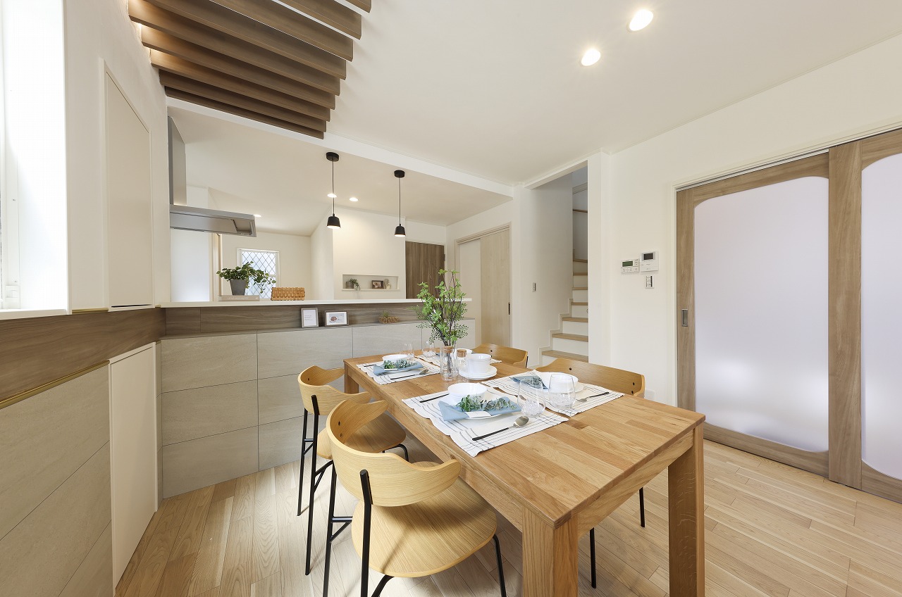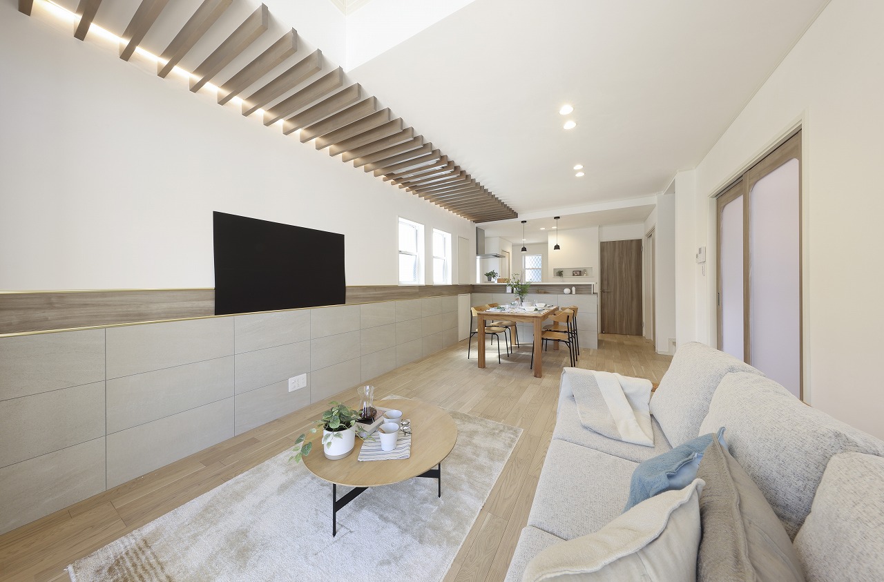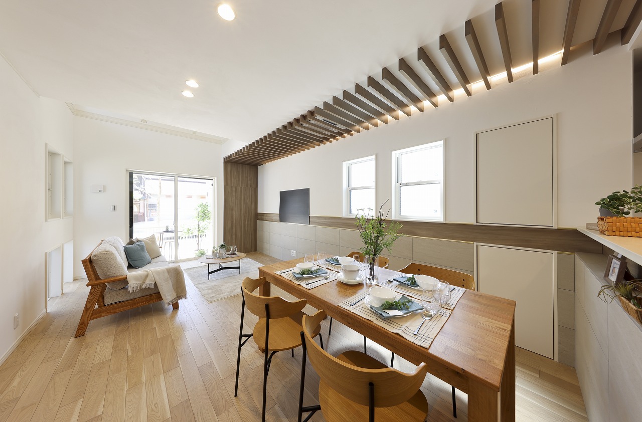 「吹抜×木ルーバーのデザイン性](LDK) 天井の木ルーバーが光を柔らかく演出し、陰影を楽しめるのが最大のポイントです。 床と垂直に配した天井ルーバーをリビング全体に連続させることで縦長空間に奥行きと視線の抜けを演出しました。