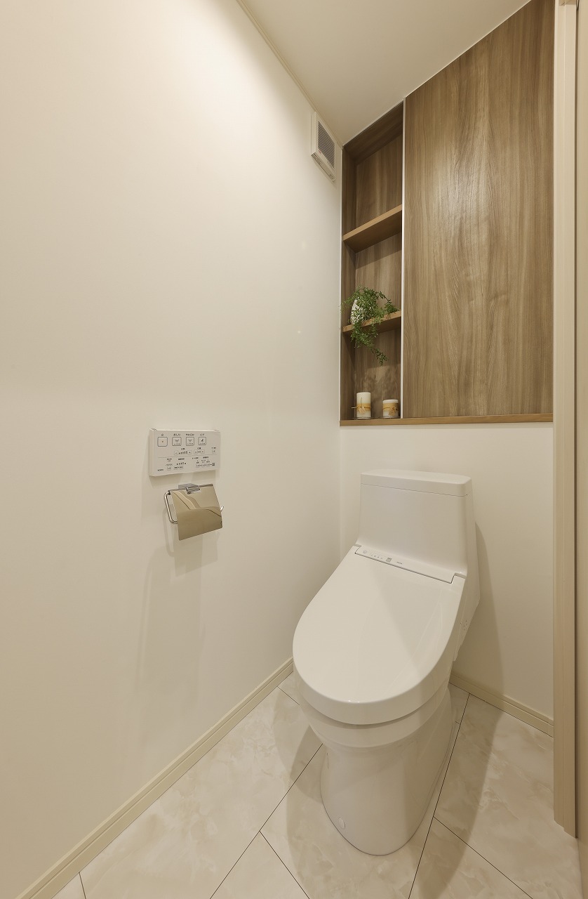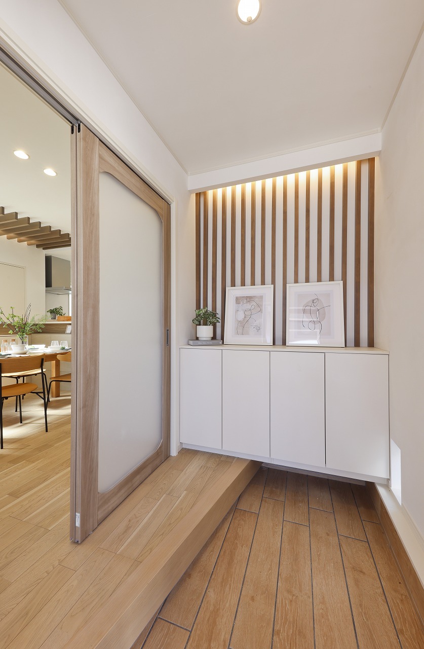 その他玄関やトイレにも同色の木目・ルーバーを使用し家全体の統一をはかった