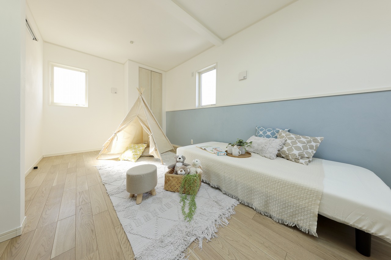 「ホテルライクなベッドフレーム一体型寝室」(洋室A) 一段床を上げたベッド一体型の寝室は、マットレスだけで過ごすホテルライクな空間に仕上げました。 LDKのルーバーを取り入れ、家全体に統一感を演出しています。
