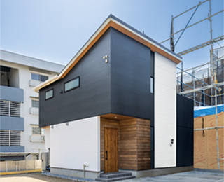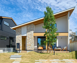 まるで別荘のような片流れの屋根に木と石でデザインされた山小屋風。庭には21帖のLDKと直接つながるカバードポーチがありを室内外一体でお使い頂けます。吹き抜けのあるモノトーンのモダンな内装も必見です。