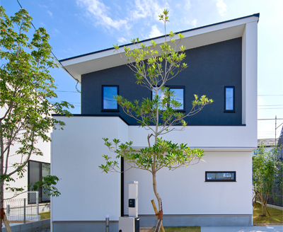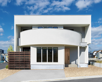 柔らかな印象に仕上がるアール壁の「北欧」テイストを「和」モダンにミックスさせた、インテリアデザインコンペで票を集めたデザイン性抜群の住まい。インテリアとしてだけでなく、アールの壁がゆるやかにゾーニング。和室をLDKと一体としても使え、20帖の広がりを感じさせます。LDK上部は全面勾配天井とし、南に面してバルコニーも設けました。