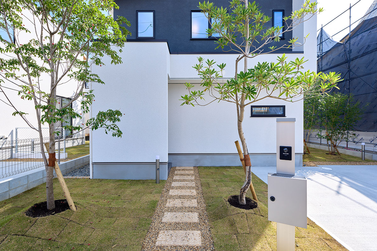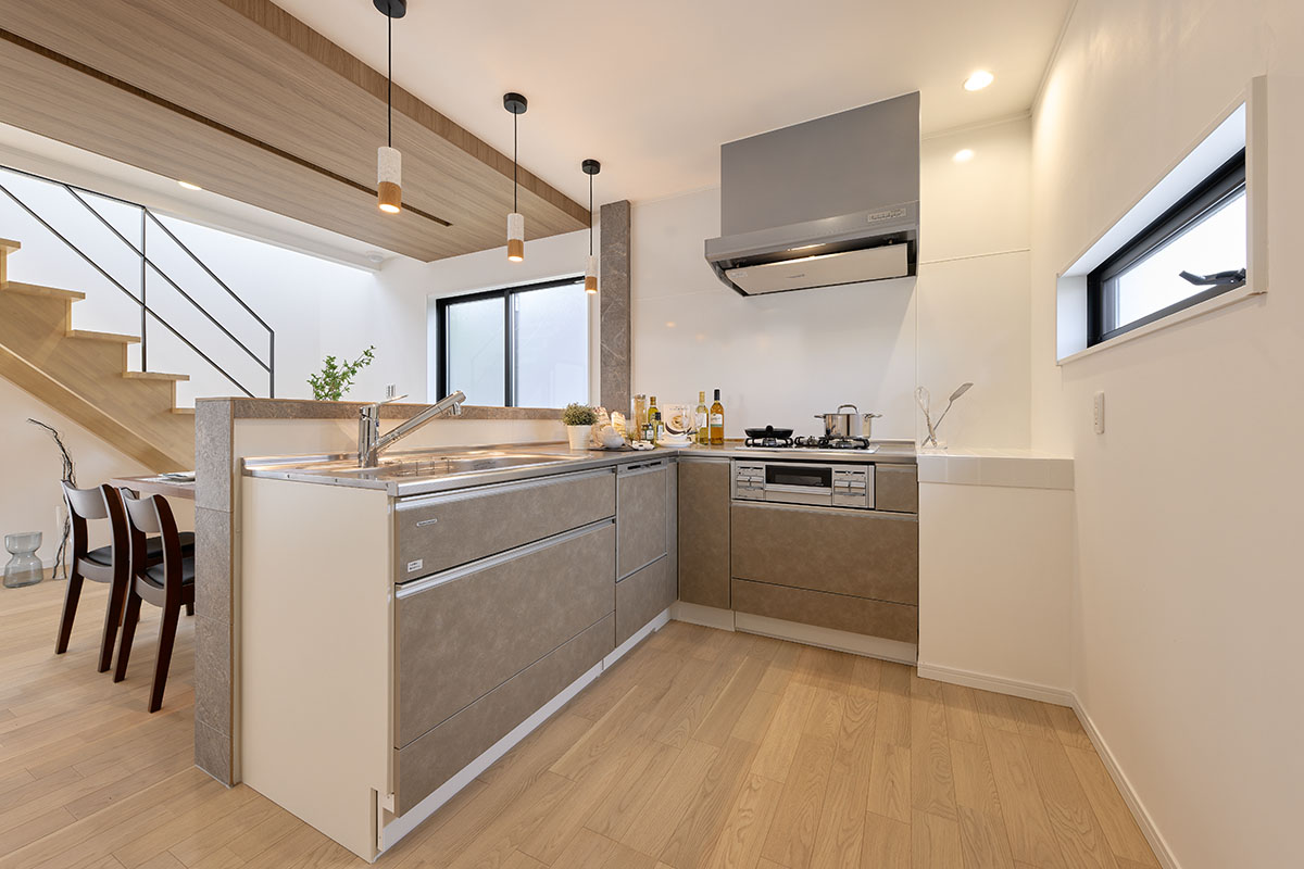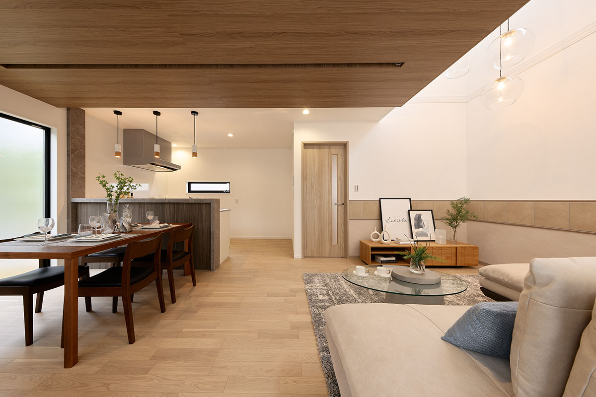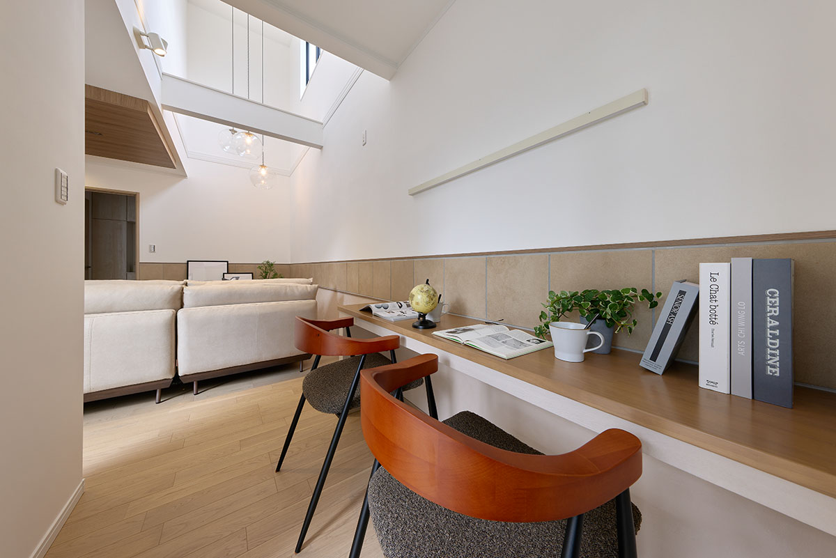 室内とテラスが一体になるLDKは、石と木を効かせたマテリアルで静かな高級感を演出しつつ、家族の動線は極めて自然。家族の気配を感じられるスタディコーナーを設け、シーンに応じて居場所が切り替わる柔軟な間取りです。屋外と室内をほどよくつなぐ設計で、毎日がリゾートの余韻を帯びていく邸宅です。