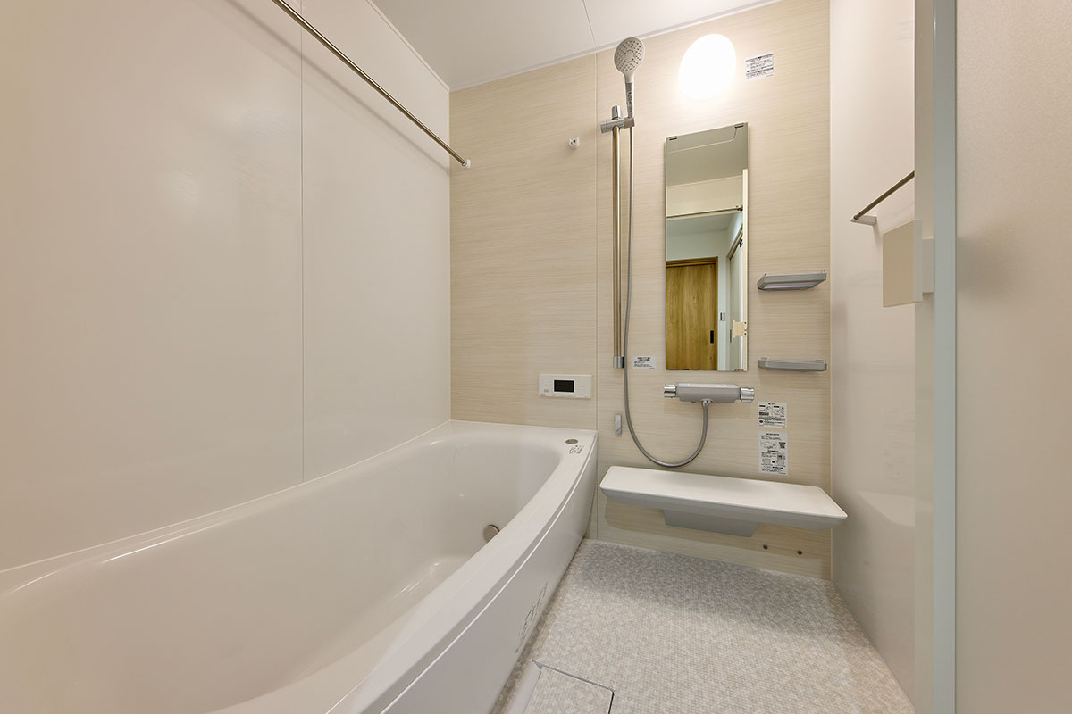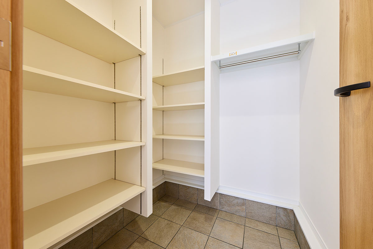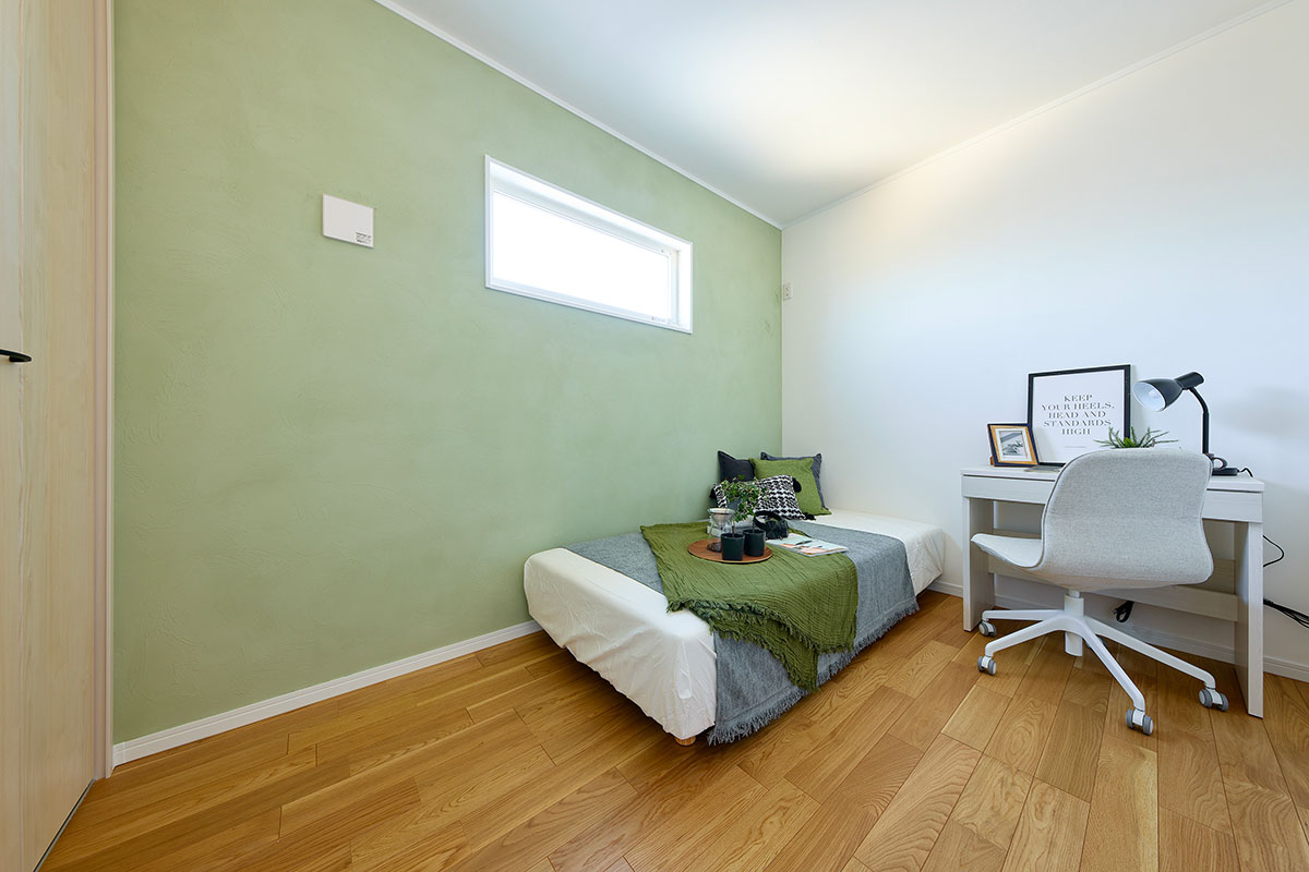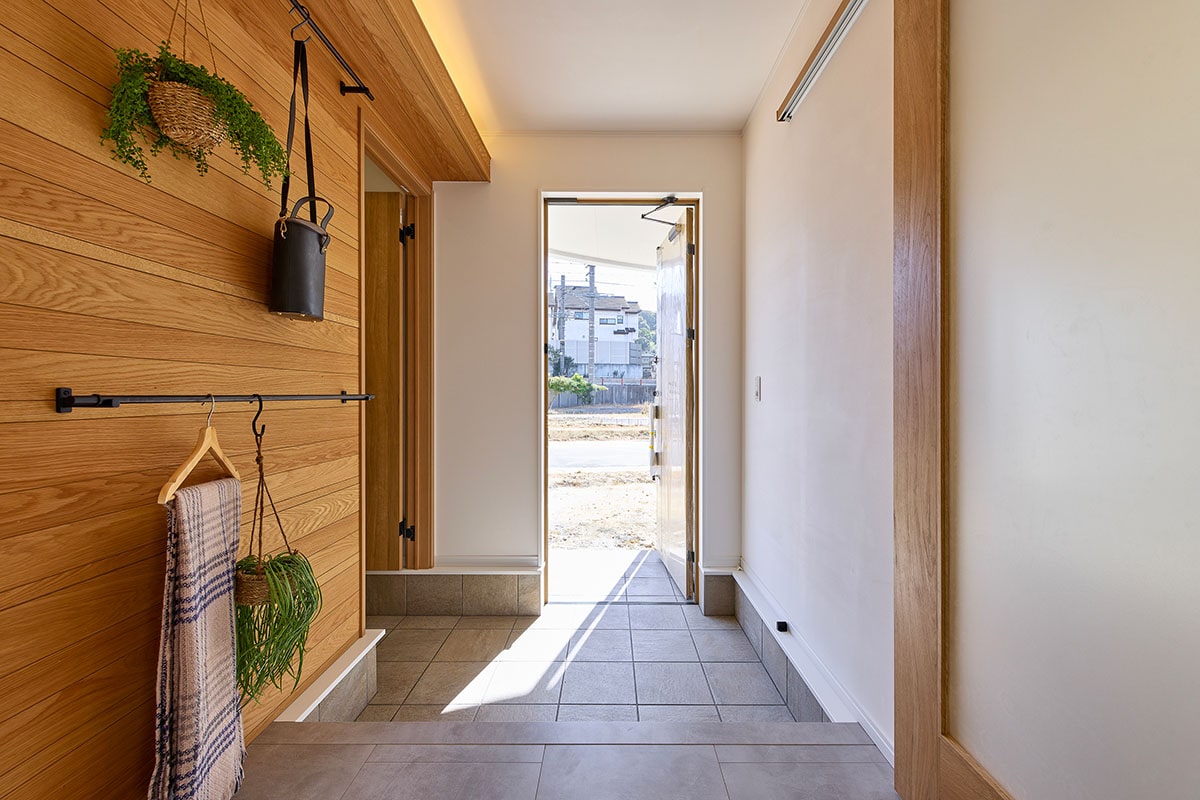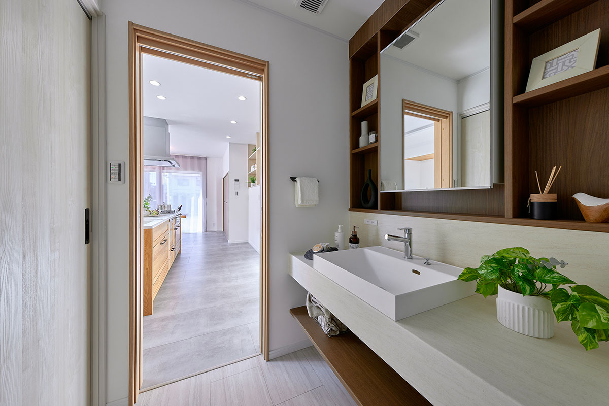 特徴的なアールを描く外観と、窓の多い明るい室内を際立たせるため、LDKはシンプルで上質な空間に。階段下の「ヌック」や窓際の「小上がり」など、家族が思い思いの場所でくつろげるリビングを実現しました。LDKをはじめ、玄関や寝室に至るまで、空間全体に統一感のあるテイストを施し、住まい全体にやわらかな調和と心地よさをもたらしています。
